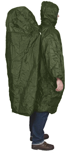 - Dit is een poncho met een extra, soms uitritsbare, ‘bult’ waar je rugzak onder past. Het kan klein worden verpakt en is daarom handig om mee te nemen.